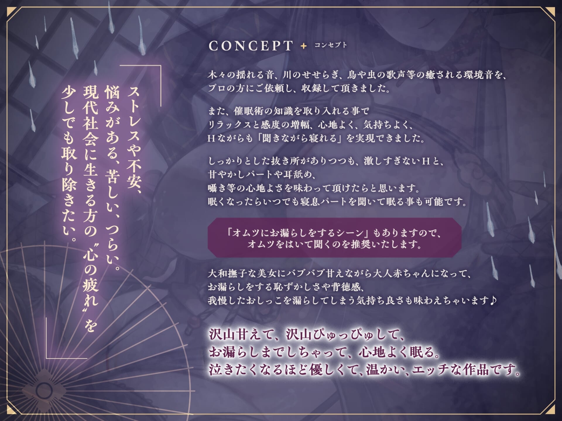 プロにご依頼し収録して頂いた心地の良い環境音や丁寧な編集の他に、今作は催○の知識も取り入れ、より深くリラックスし、現実と離れた心地の良い世界に没入出来るようになっております。