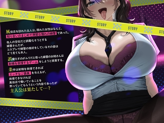 - 風俗店を訪れた主人公。現れた女性はなんと、知り合いのまじめで清楚な憧れの婦警であった。 他人の空似だと誤魔化そうとする婦警さんだが、コスプレで婦警の格好をしているその姿はどう見ても本人。 誤魔化すのがムリだと悟った婦警のお姉さんは射精を我慢するゲームをしようと提案する。 条件は射精を我慢できればエッチなご褒美を与えるが、 我慢できなければ風俗店で働いていることを黙っていてもらうという内容であったが主人公は果たして…?