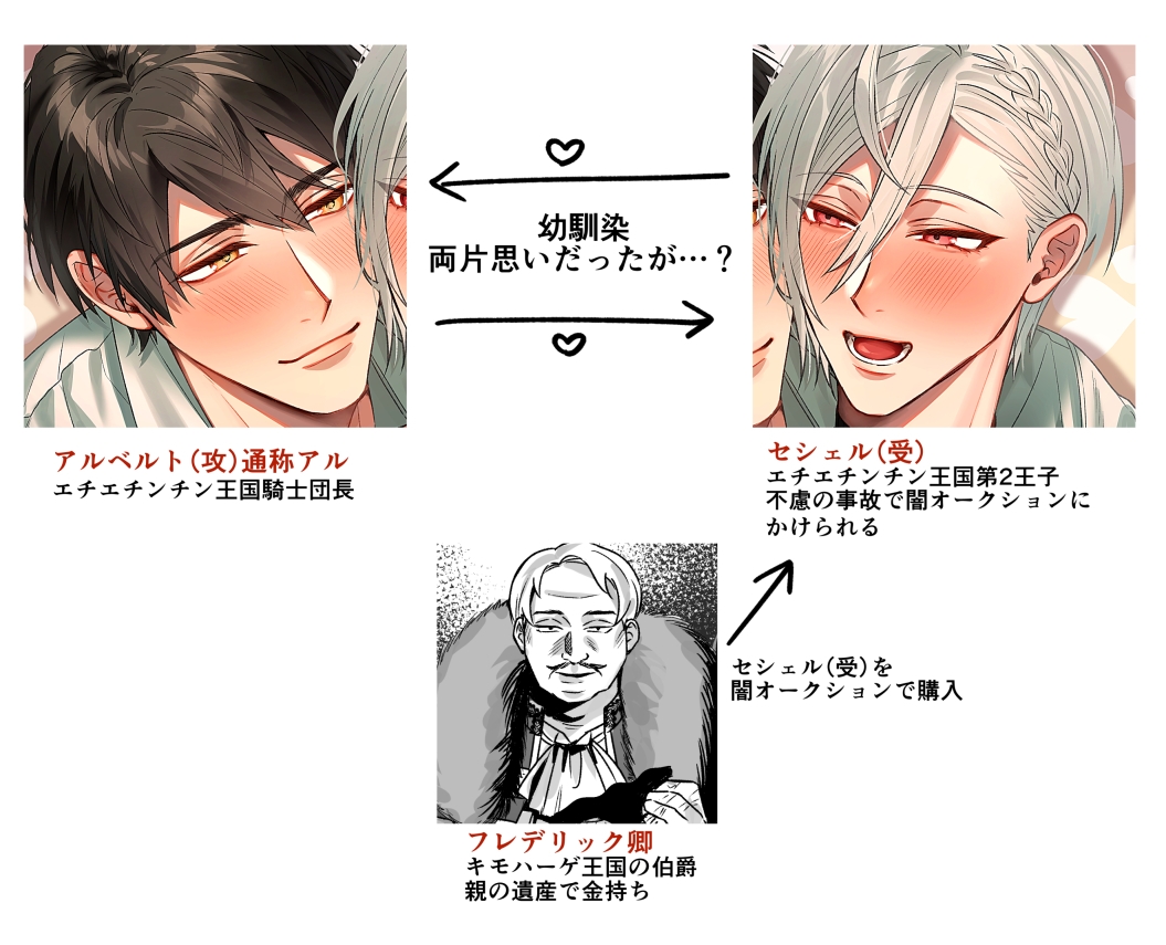 - 敵国モブおじ×受、幼馴染巨根攻×受 闇オークションにかけられた受の話です。最終的にはハッピーエンドです。