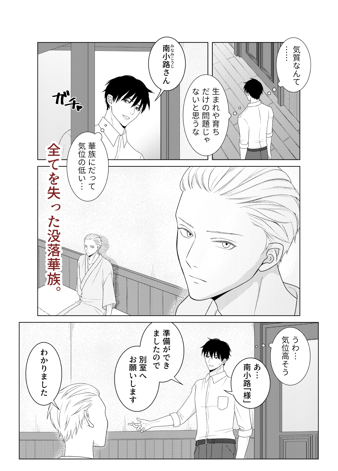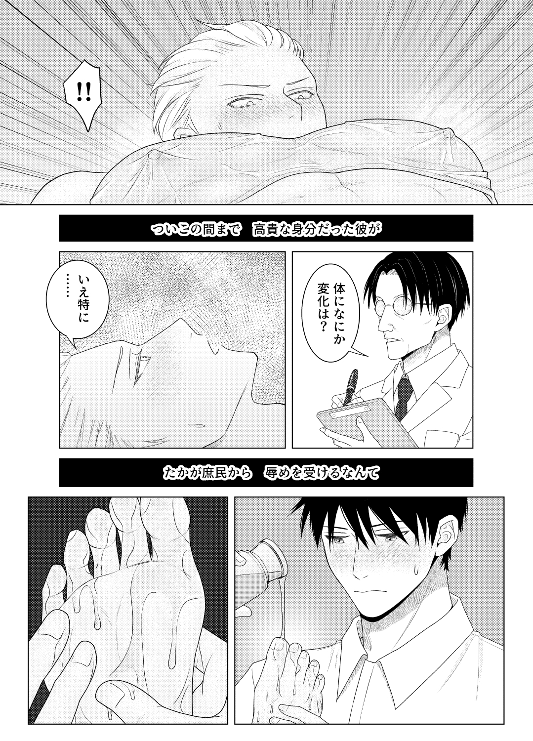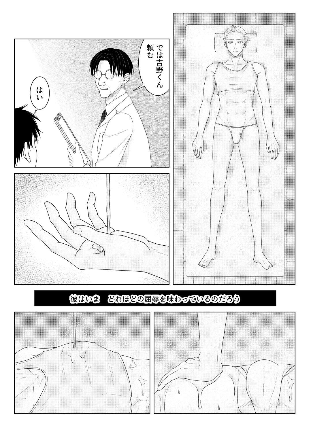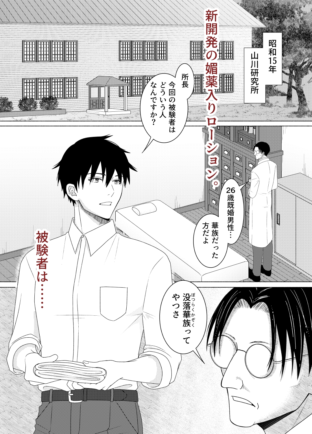 - 戦時中の日本──研究所では自白剤の代わりとなる媚薬ローションを開発していた。被験者は地位も財産も失った元華族。助手の吉野は初めこそ被験者に同情していたが、彼の反応を見るうちに暗い欲望を抱きはじめる。吉野の媚薬マッサージと言葉責めにより、被験者の尊厳はどんどん失われ……。ローションマッサージ、乳首責め、前立腺責めなど。