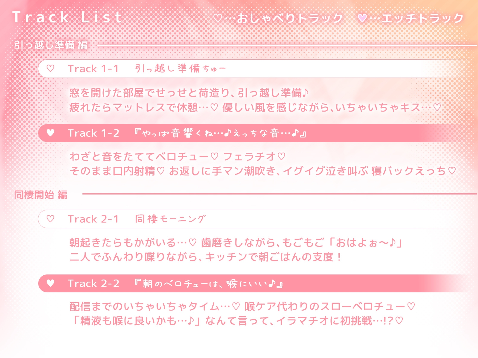 - マンションに2人部屋の空きが! 即決まさかの同棲開始っ!! ……今回は【引っ越し準備編】【同棲開始編】【もかパンダ編】の3エピソード!! 歯磨きシーンはなんと【本当に浅木式さんが歯磨きしながら】ご収録。過去最高に生っぽい"日常いちゃラブ"音声です♪ 付き合って何年も経っているはずなのに、面と向かって『愛してる』がまだデレッデレになるナチュラル女子と、初めてまみれの同棲生活♪ ぜひお楽しみください♪ (CV.浅木式)