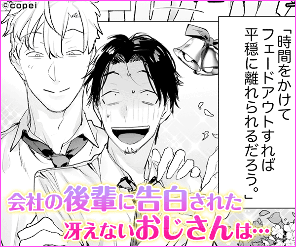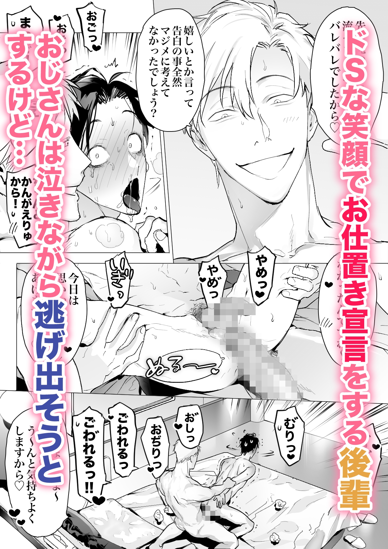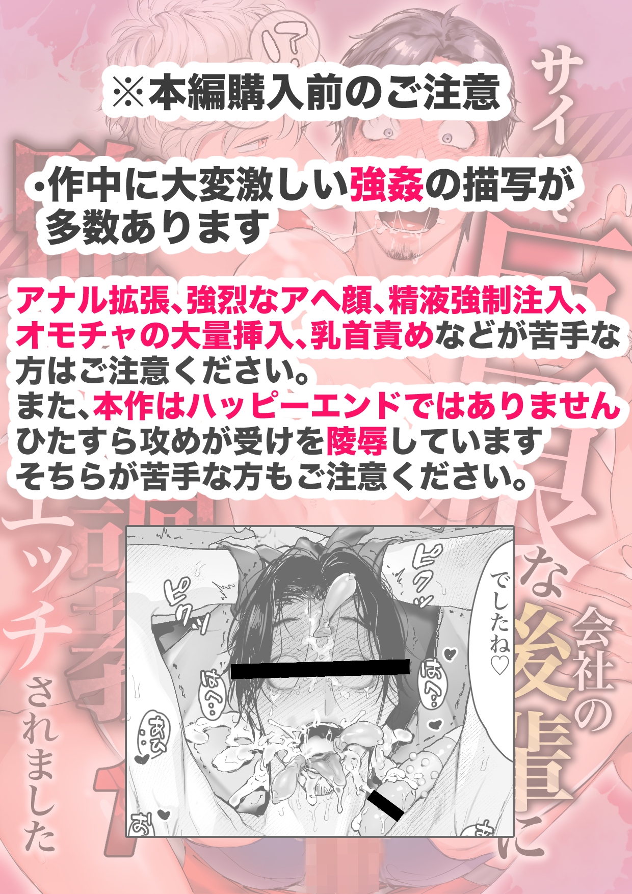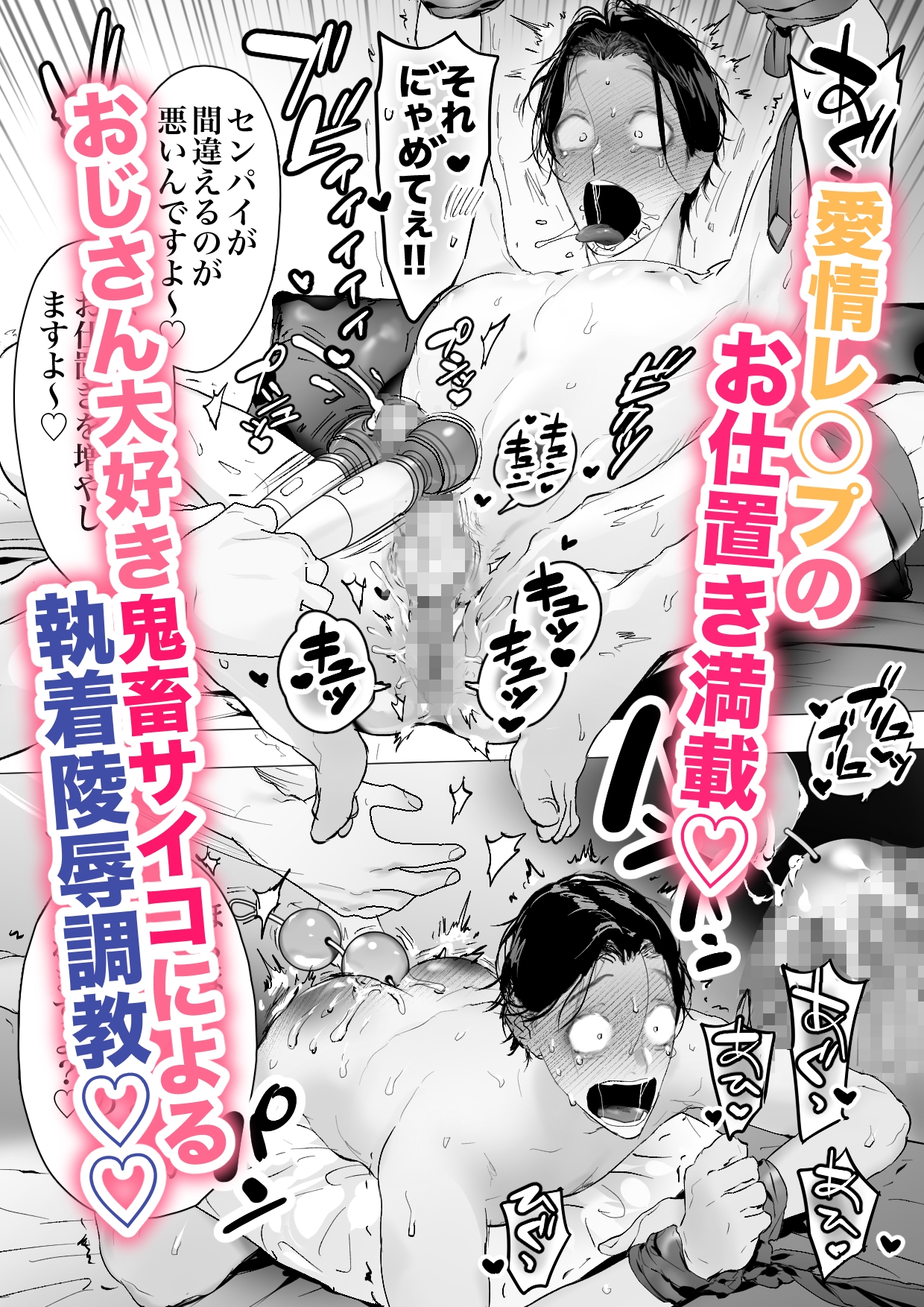 - 「先輩の事が好きでした」平凡な生活を送るおっさんサラリーマンの主人公は、ある日突然イケメンな後輩から告白される。驚き戸惑う主人公だったが、後輩は強引に主人公をラブホへと連れ込み、サイコめいた執着心で陵○の限りを尽くしていく……!
