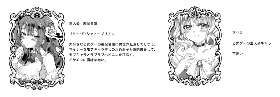 - モブ推しのJKが乙女ゲーの悪役令嬢に転生!推しのモブキャラとラブラブハッピーエンドを目指して奮闘するも、婚約者のイケメン王子に好きなモブを人質に取られる形で無理やり鬼畜凌○されることに。続編の花嫁修業とは名ばかりの肉欲にまみれた調教の日々。絶対、王子の思い通りになったりしない…そう心を強く保とうとするが…。
