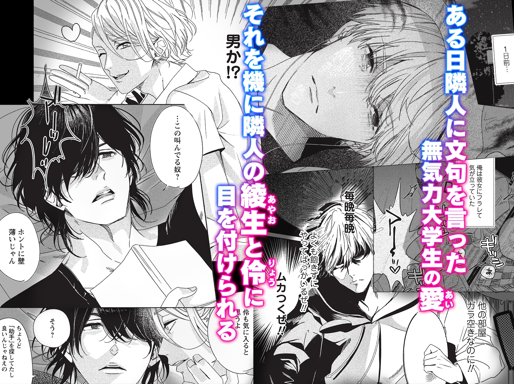 意を決して文句をつけたところ…ハスキーでエッチな喘ぎ声は男同士のものだったことを知る。