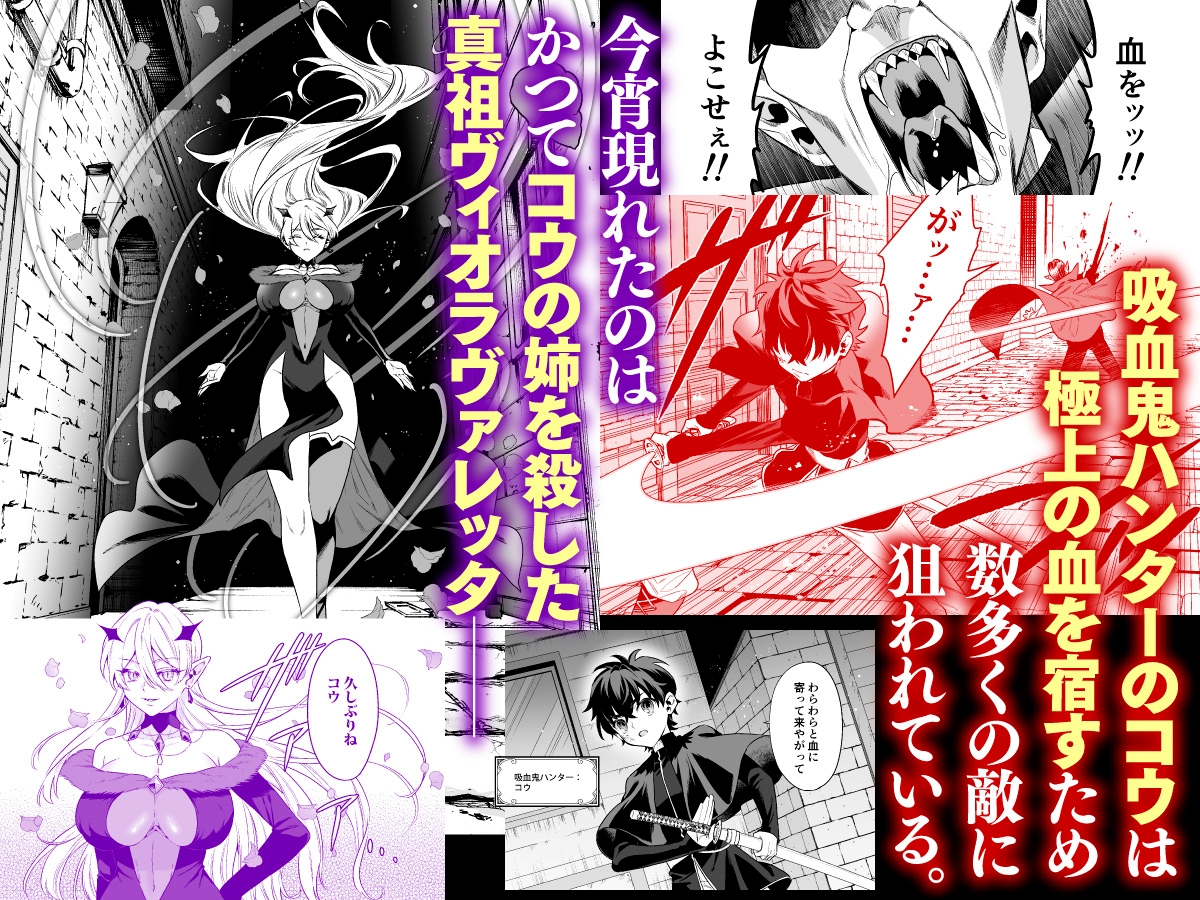 - 吸血鬼ハンターのコウは、宿敵である真祖吸血鬼・ヴィオラヴァレッタ、そしてヴィオラに吸血鬼化させられた姉メルノに捕らわれてしまう。ふたりの目的はコウを眷属にしてその血を永遠に味わうこと。抵抗するコウに、逆レ○プの快感○問が襲いかかる――【収録プレイ】男性受け/逆レ○プ/3P/媚薬/触手/拘束/乳首責め/逆アナル/長舌フェラ/大量射精/パイズリ/クリチンポ逆挿入/挿入/淫紋
