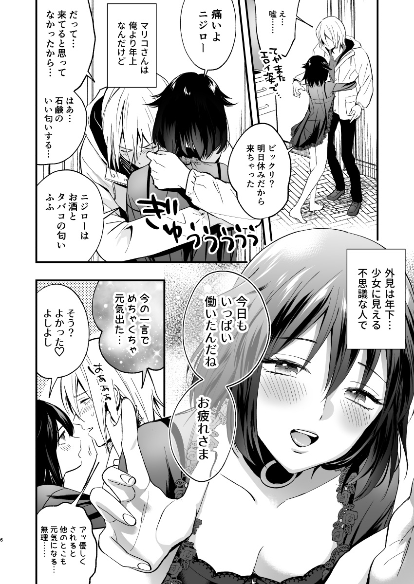 - 青年×○リお姉さんシリーズその1。ルックスは良いが他に突出すべき長所がない男ニジローと彼を溺愛する少女のような見た目の女マリコの、甘くてちょっとビターないちゃラブエッチ作品。