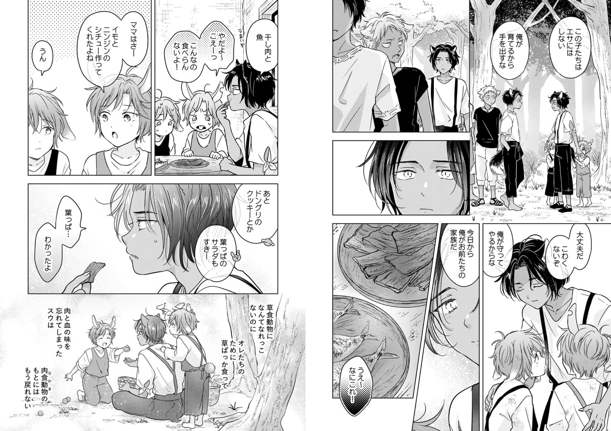 爪や牙もなく、肉も食べない二人を怖がらせまいと、一緒に暮らすうちに自分も草食の生活を始めるスウ。