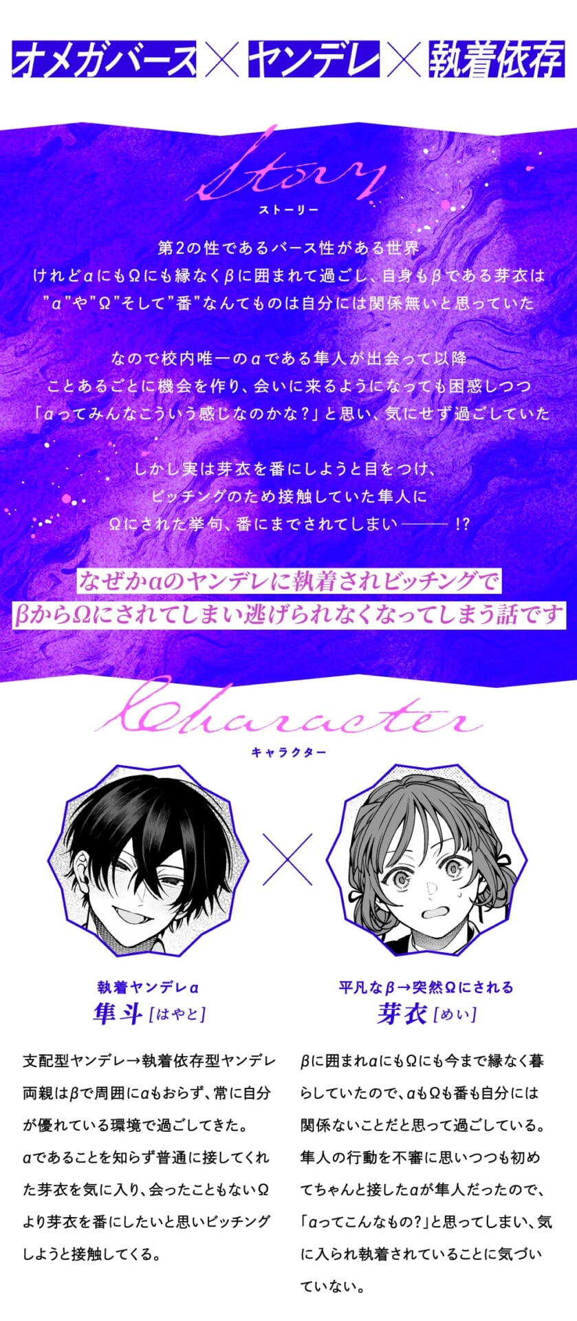 - 「番になったんだからさあ どーせ俺から逃げられないじゃん」 “運命”と確信して無理やり番にした執着ヤンデレα×ビッチングで突然Ωにされたβ ヤンデレαにビッチングでβからΩにされ、番になってしまい逃げられなくなるオメガバースストーリー