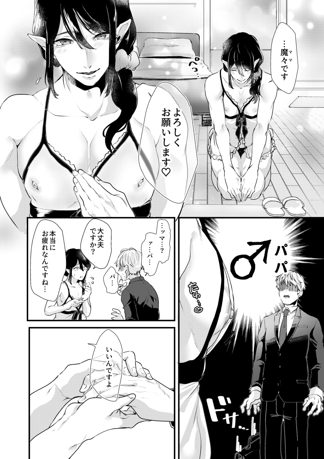 女よりオフトンが恋しい若干バブ化サラリーマンに悪魔コスの客引きが声掛け。着いたのはおっきぃママ…じゃなくてパパのいる店でした。(尻尾生えてる…)【BL】