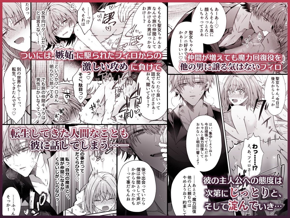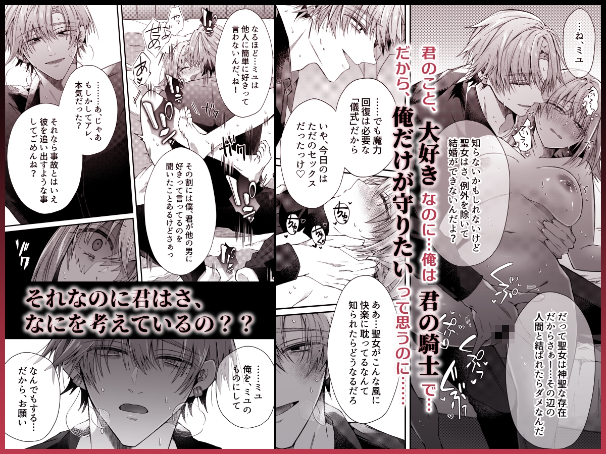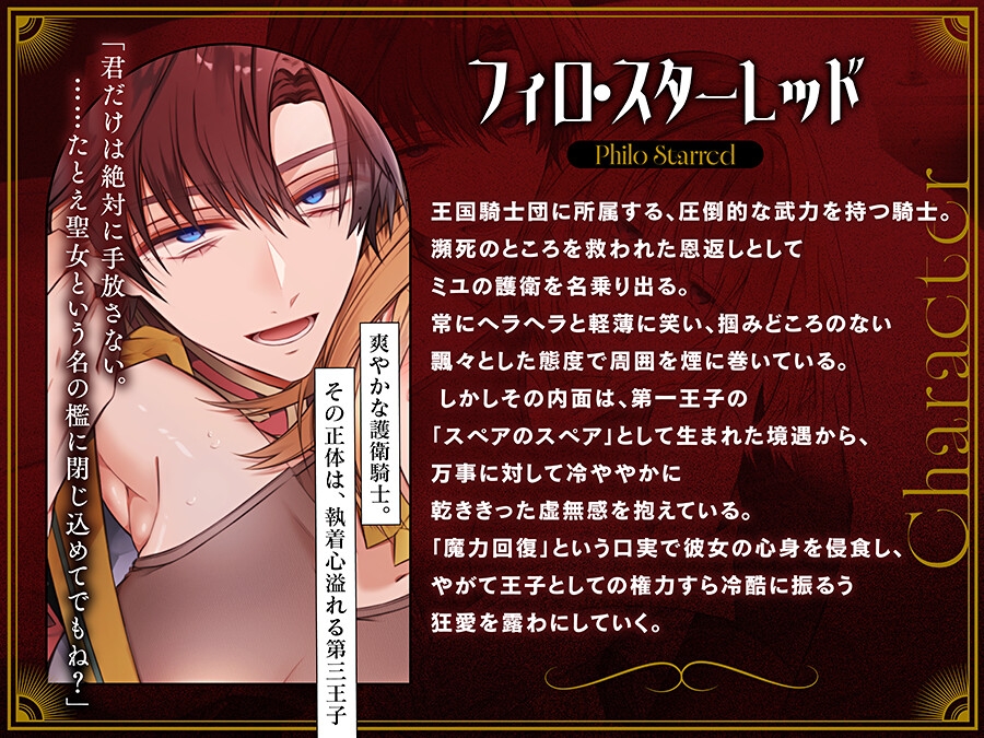 - 【湿度高めヤンデレ騎士×異世界転生聖女】大好きなゲーム世界の聖女に転生したヒロイン。たたださえとんでもない状況の中、瀕死の騎士「フィロ」を発見し…。彼の命を救ったことがきっかけで「護衛騎士」として王様に強○的に命じられた魔王討伐の旅に同行してもらえることに。旅の中で2人の仲は深まっていくが、同時に一見明るくノリのいい彼のじっとりとした感情があふれ出しはじめ…―